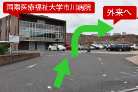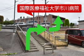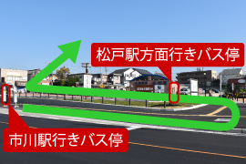 - JR総武線「市川駅」北口から京成バス「松戸営業所」行き(松11)もしくは「松戸駅」行き(松11)に乗り、「矢切駅(国際医療福祉大学市川病院入口)」で下車、徒歩3分。市川駅北口のバス停の場所はこちら(京成バス ホームページ)