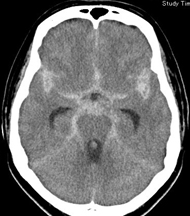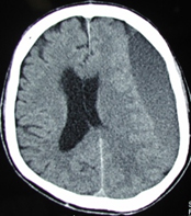 下の頭部CT画像は、歩きにくくなったという訴えで受診された高齢の男性で、左側(図の右側)の脳表に出血が貯まって脳が左から右に強く圧迫されています。頭部外傷から1~2か月経って発症する慢性硬膜下血腫という病気です。患者さんは1か月ほど前に転倒したとのことでした。