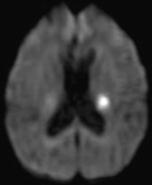 下図の頭部MRI画像は、突然の右半身脱力で発症した男性で、拡散強調画像という撮像法によって、左大脳深部の小さな脳梗塞が白い異常信号域として描出されています。