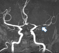 下の画像の患者さんは、突然右手足に力が入らなくなったが少し経って治ったという症状で受診しました。脳内の動脈を描出するMRA検査で左中大脳動脈に狭窄部位(矢印)が見られます。狭くなった動脈の末梢に頭皮の動脈でバイパスを作る手術(浅側頭動脈―中大脳動脈吻合術)を行い、脳梗塞を発症する事なく元気に過ごされています。
