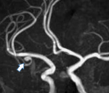 下図は頭痛の検査で偶然見つかった右中大脳動脈の未破裂脳動脈瘤(矢印)の患者さんのMRA画像です。