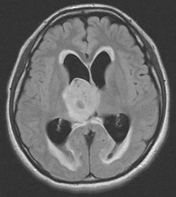 多くの頭痛はあまりご心配ないものですが、時に脳腫瘍や脳出血などが潜んでいる事があります。下の脳MRI画像は、片頭痛で治療されていた患者さんに見つかった脳腫瘍です。頭痛が続いている方は一度精密検査をお受けになって下さい。