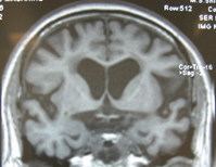 高次脳機能検査で認知障害が疑われた場合に、脳MRI検査など画像診断で原因を調べます。認知症の原因として最も多いアルツハイマー型認知症では、下の脳MRI画像のように記憶に関わる側頭葉内側の海馬の萎縮が見られます。初期のアルツハイマー型認知症では、海馬萎縮は軽度で、判定が難しいのですが、当院ではこれを定量的に診断するソフトウエア(VSRAD)を利用して、より確実な診断が可能になっています。