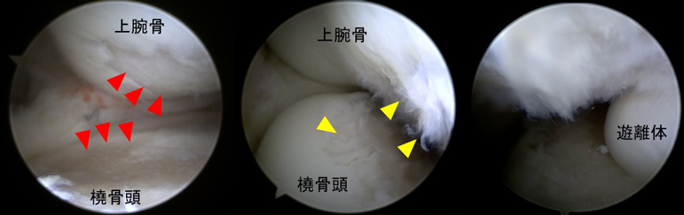 (左:前方鏡視、中:後方鏡視、右:肘関節内遊離体)