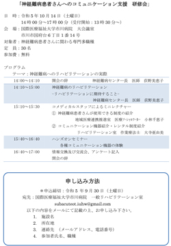 今回は、神経難病患者様に対するリハビリテーションに関して、講義や実習を通して学ぶ機会となっております。是非、多職種スタッフをお誘いの上、ご参加ください。つきましては、下記の通り開催致しますので、ご多忙とは存じますが是非ご参加頂きたくご案内申し上げます。