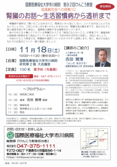 今回のけんこう教室では、腎臓病や透析についてわかりやすく説明します。特に、毎日の生活のなかでの注意点について一緒に勉強しましょう。